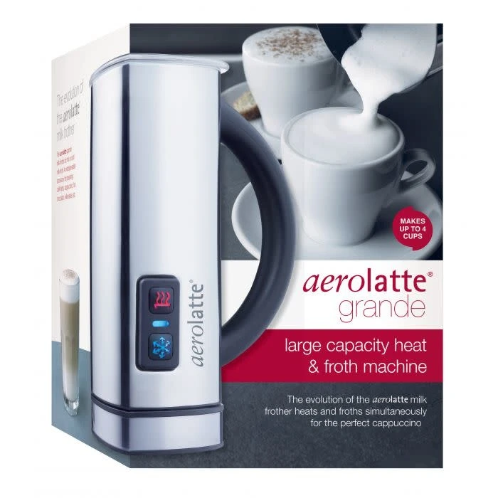 Aerolatte’s Grande Hot Milk Frother Jug, with an ample 24-ounce capacity, aerates and warms up to 4-cups of froth automatically. It includes Aerolatte’s Original spiral whisk attachment to aerate milk into a thick, rich foam, a warming paddle to gently stir milk as it warms without creating any froth, and complete instructions. It’s easy to use and more compact and economical than espresso machines. Froth all types of milk, from whole, skim or goat milk, to hemp, almond, soy, cashew, coconut, and other non dairy milk. However, full-fat milk froths the best. Simply add milk into the carafe, attach the spiral whisk to froth or warming paddle to stir, secure the lid and power on. Easily monitor progress of the contents through the viewing lid. Once done, pour any remaining un-frothed milk into the beverage, then gently float froth on top. Add flavorings before frothing, if desired. It makes afternoon snack time more fun and is a great addition to coffee accessories to transform fresh-brewed coffee into specialty coffee drinks. Great for cappuccino, cafe au latte, caramel macchiato, mocha, Irish coffee or iced coffee. Elevate hot chocolate from ordinary to extraordinary or finish craft cocktails with panache. Made from stainless steel, steel, and BPA-free ABS to be Prop 65 compliant, Aerolatte’s Grande Hot Milk Frother Jug is versatile and easy to use. Wipe clean after each use.