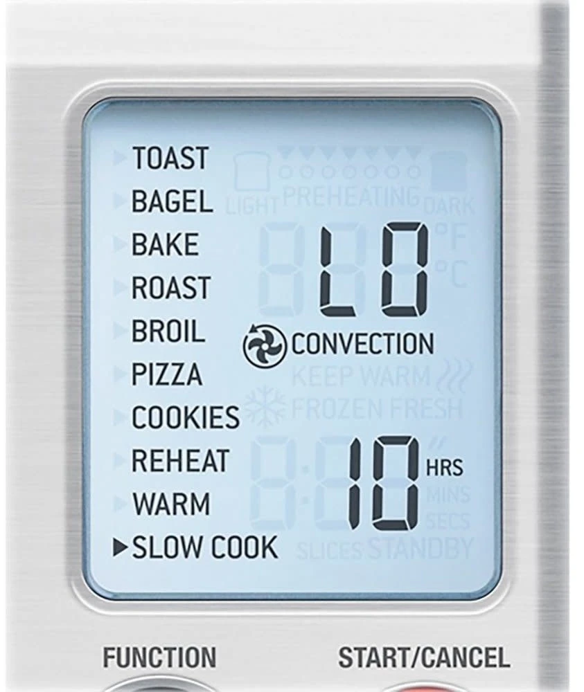 - 10 pre-set cooking functions include: toast 6 slices, bagel, bake, roast, broil, pizza, cookies, reheat, Warm, slow cook