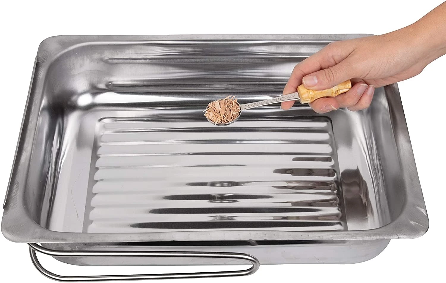 - Includes – Stovetop Smoker, Stick-Free Rack, Drip Pan, Lid, Wood Chip Sample, and Recipe Guide!