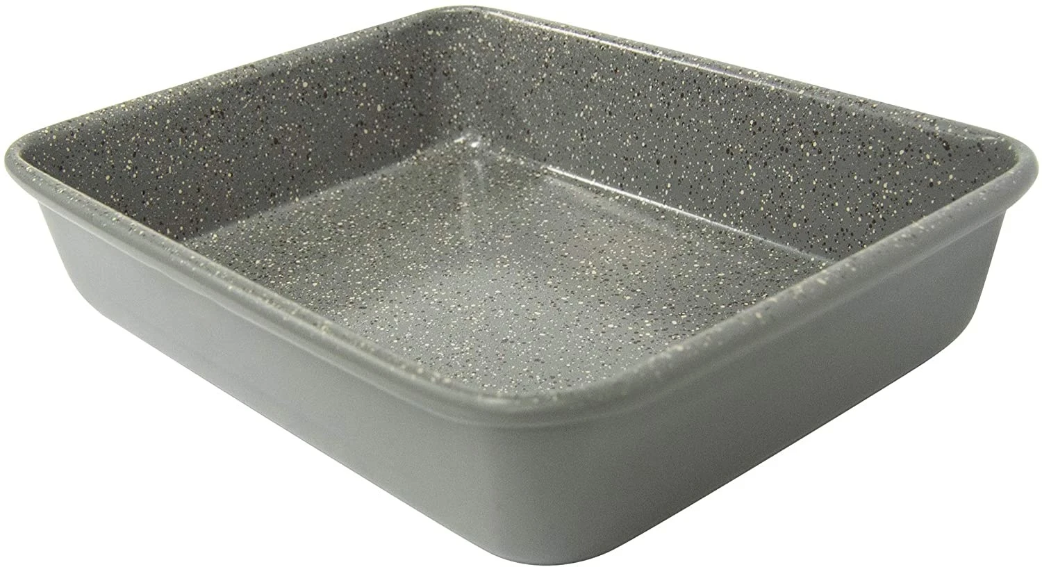 This pan features our exclusive silver colored granite ceramic coated easy release baking surface. Its rich cream and brown accent flecks make this bakeware both high fashion and high function.