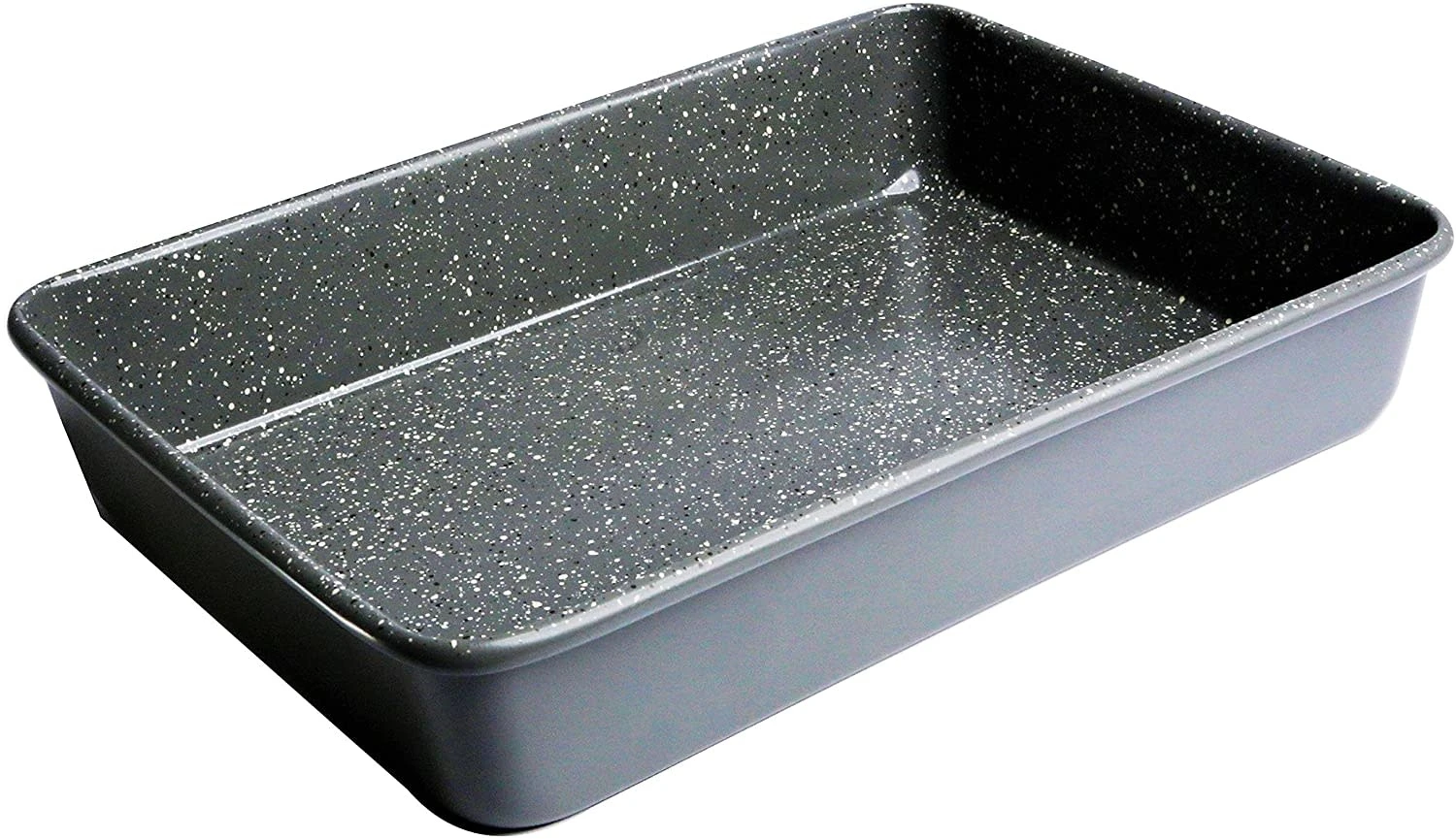 This pan features our exclusive silver colored granite ceramic coated easy release baking surface. Its rich cream and brown accent flecks make this bakeware both high fashion and high function.