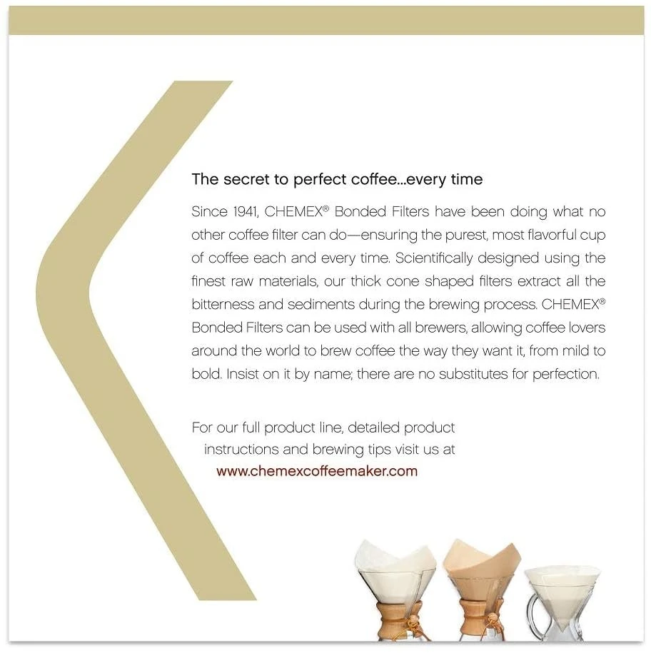 All CHEMEX® Coffeemakers used together with the scientifically designed, patented CHEMEX® Bonded Filters, will guarantee that our pourover brewing process will deliver the perfect cup of coffee, without any sediments or bitter elements.