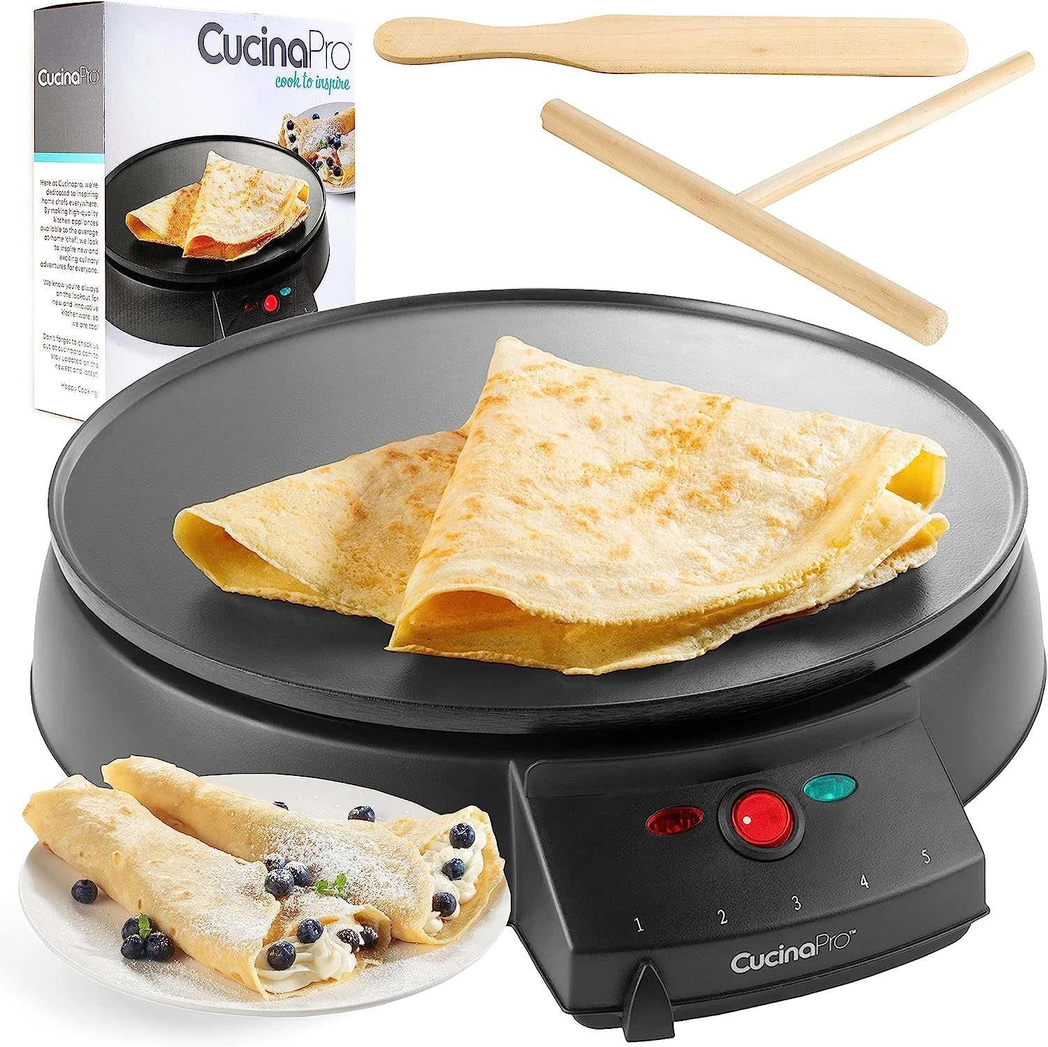Delicate crepes and blintzes are made quickly and easily on this 12″ non-stick crepe maker and griddle. The aluminum plate is also ideal for using as a griddle, perfect for making stacks of pancakes, bacon and other breakfast favorites.