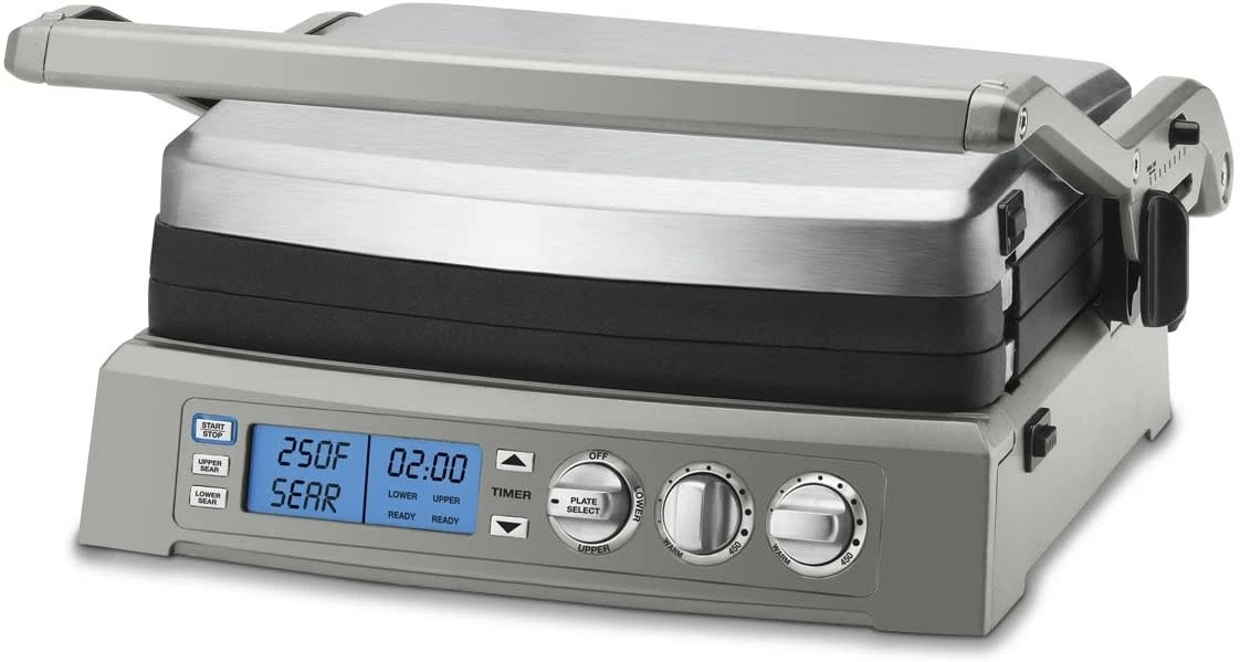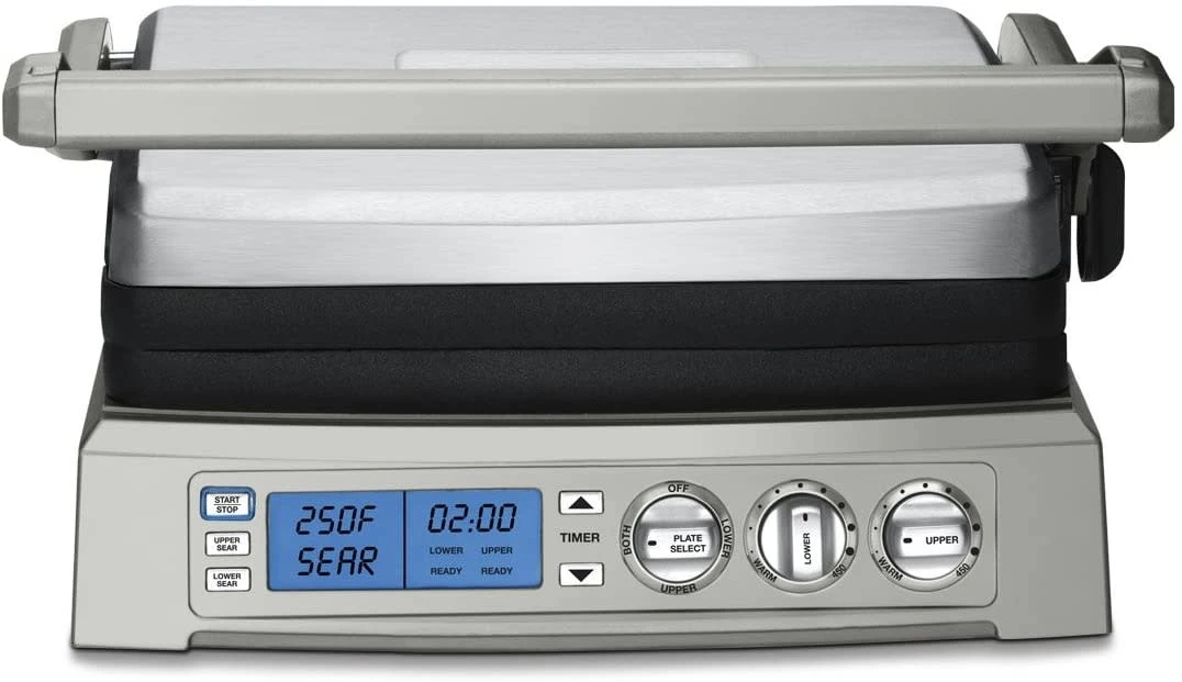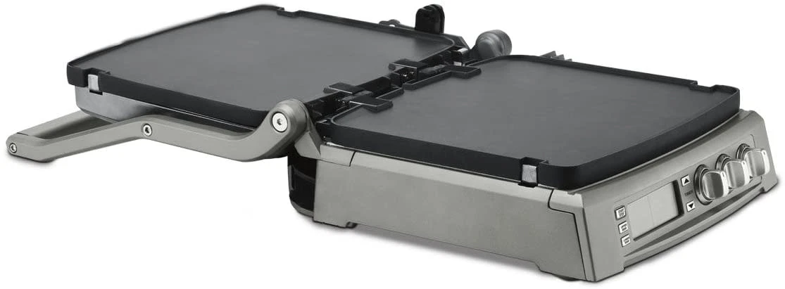 This stylish electric grill can tackle any task, with the ability to grill, griddle, half grill, half griddle, panini press, and top melt sandwiches, meats, and appetizers. The electronic display lets you set a timer and dual zone temperature control, meaning you can griddle an egg on one plate while grilling bacon on the other across a generous 240 square inches of cooking surface. With reversible plates, our superior SearBlast™ feature locking flavor into steaks at 500˚F, and a top cover that is fully adjustable, cooking is perfectly customized and precise every time. The dishwasher safe nonstick grill plates are also conveniently removable for easy clean up after even the gooiest, cheesiest sandwich or sticky barbecue sauce.