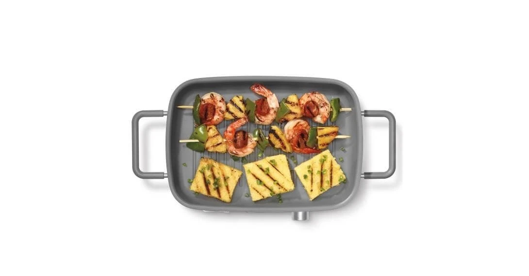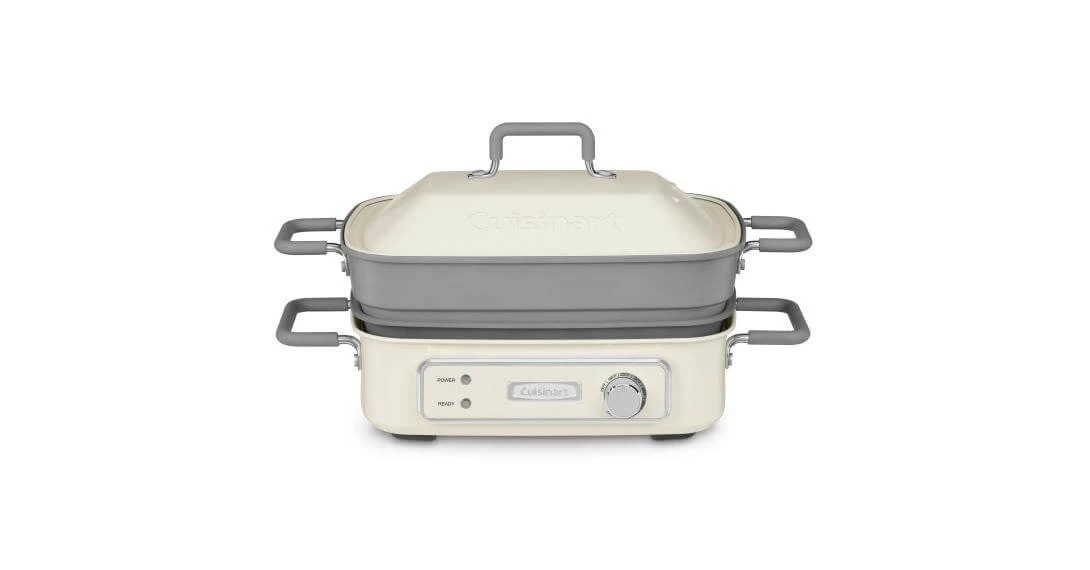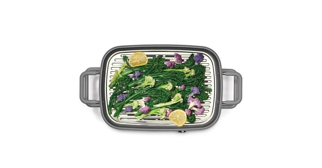 Never has there been a multipurpose grill this versatile that is also this compact! This unique counter-top unit cooks 6 different ways, replacing the need for multiple cooking appliances. The grill plate sears meats and vegetables or, when swapped for a stainless steel rack, easily steams foods. A 5-quart deep, nonstick pan can be used for slow cooking, baking, griddling, and browning or sautéing. Temperature presets adjust at the turn of a dial. Plus, the removable plate and pan are durable for long-lasting use and dishwasher safe for easy cleanups.