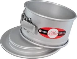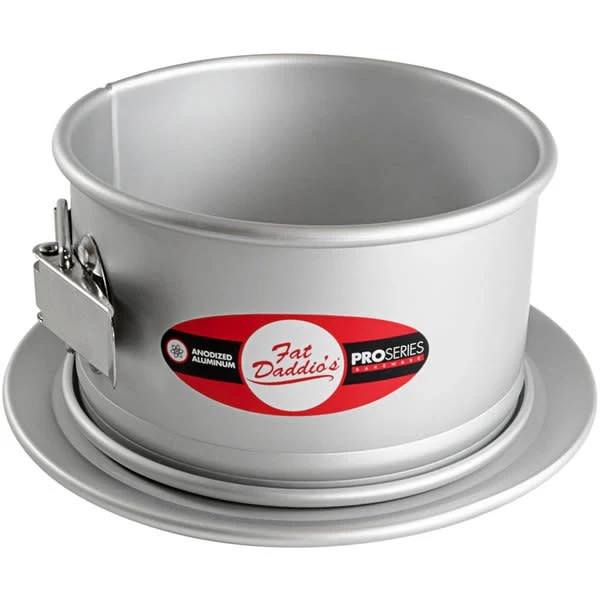 These 3” deep springform cake pans allow room for adding fruit or streusel topping while it is still in the pan. The wide pedestal base makes it easier for handling and transporting your cake and also doubles as a cake stand. These anodized aluminum pans can be used for any cake batter, but are ideal for cheesecake, upside-down cakes and streusel-topped cakes.