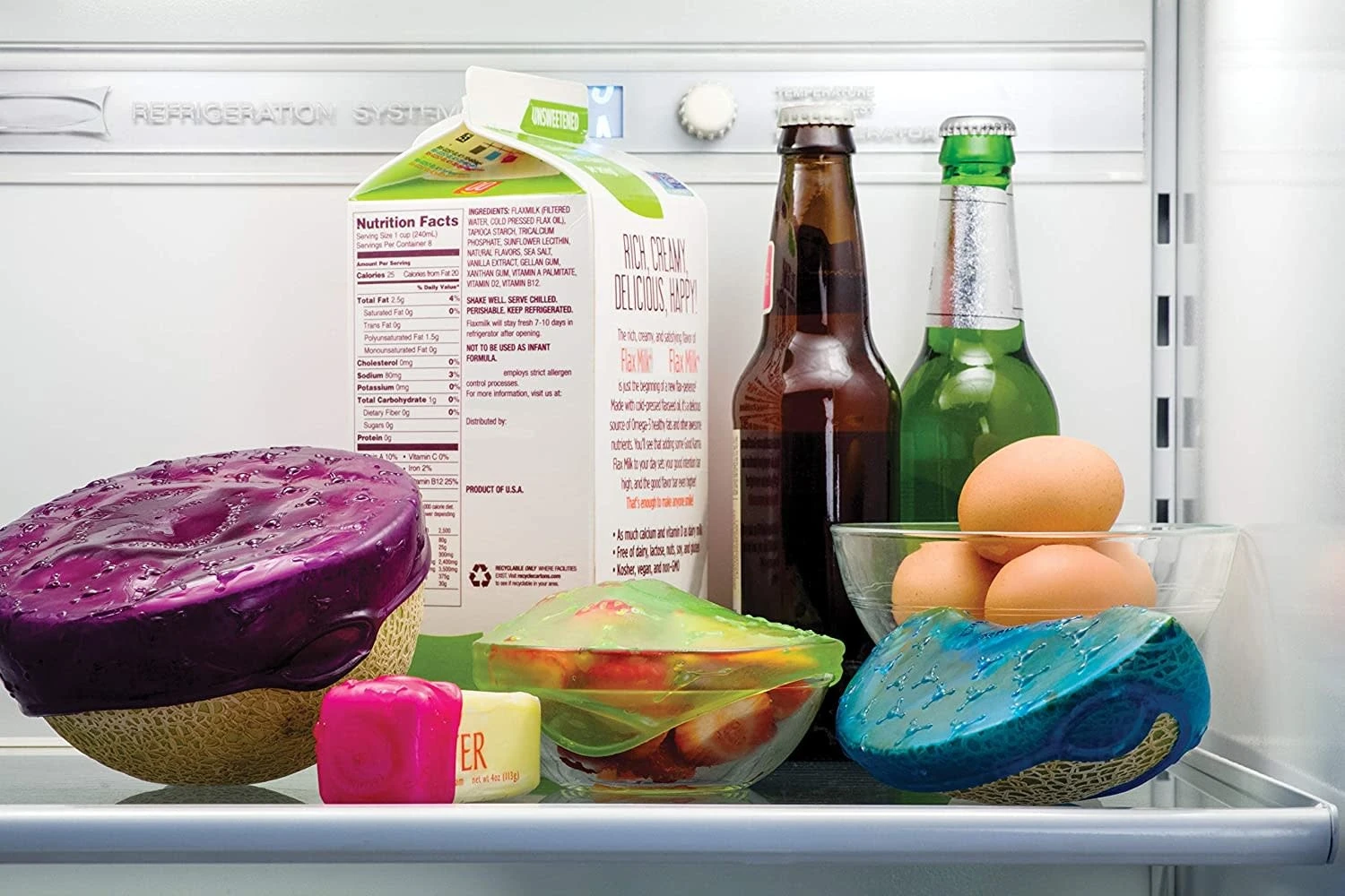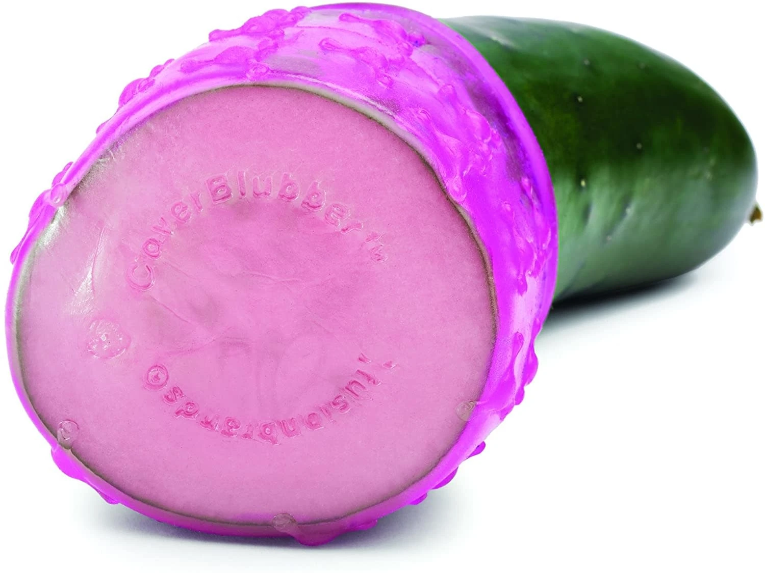 It’s the super stretchy food cover for use inside the refrigerator or freezer. CoverBlubber® is made of food safe StickyRubber™, a safer alternative to plastic wrap, that you can place directly on food or containers of various shapes and sizes. The CoverBlubber® is the perfect food storage solution–it stretches and clings and form fits to fresh cut food and just about any container.