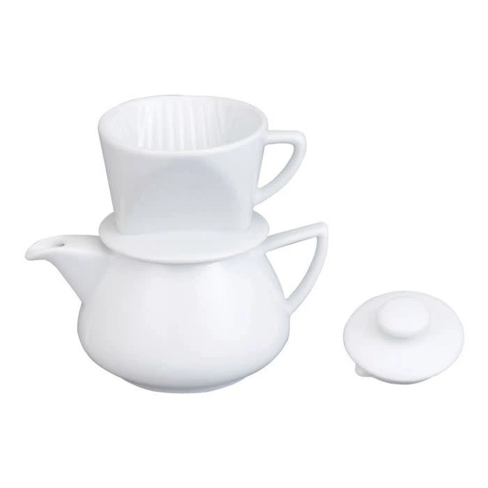 This delightful two piece white glazed ceramic Coffee Maker quickly makes two cups of coffee. Simply place a coffee filter and grounds in the cup-shaped strainer, then pour hot water over the grounds. It’s easy and dishwasher safe.