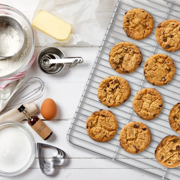 Mrs. Anderson’s Cooling Rack is the perfect addition to baking supplies for many baking, roasting, cooling, and food preparation tasks. It’s designed to elevate foods, baking dishes and casseroles for better heat circulation so they cook evenly. Great for baking bread, cookies, and other sweet treats, or dehydrating fruit for healthy snacks, beef jerky and homemade dog treats, or use inside a roasting pan for making oven roasted vegetables, like roasted beets, brussels sprouts, or butternut squash, baked potatoes, French fries and crispy bacon. It lifts baked goods and bakeware above countertops for better airflow and faster cooling times. Makes a great workspace for finishing foods, like decorating cookies, cupcakes, and so much more. Made from extra sturdy 3.6-millimeter chrome-plated steel wire for durability, it’s oven safe to 500-degrees Fahrenheit and won’t scratch surfaces. Its reinforced frame easily supports heavier baking pans and casseroles. Measures 16.5 x 13-inches. Not intended for direct flame, grill use, or dishwasher. Never use metal tools, abrasive cleansers, soak rack too long, or cut foods on the rack. Remove stubborn food bits with a gentle brush. Hand wash in warm, soapy water and dry thoroughly.
