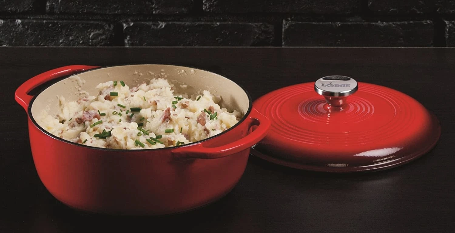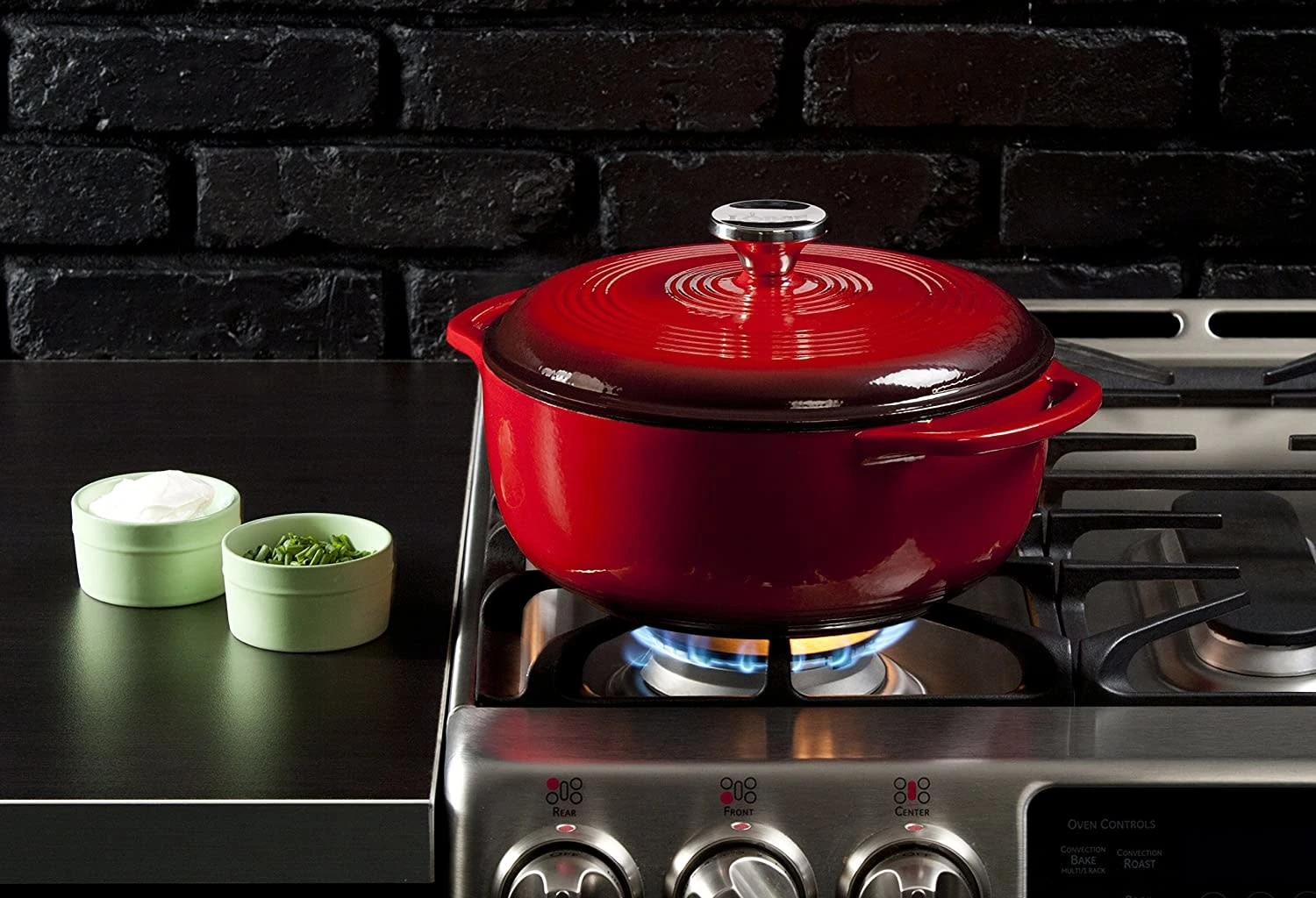 This vibrant Dutch oven has black matte enamel rims, its cooking surface is beige enamel, and the smooth glass surface won’t react to ingredients. Use it to broil, braise, bake, or roast in the oven up to 500° F, and sauté, simmer, or fry on any stovetop, as well as to marinate and refrigerate food. Plus, comes with 6 pot protectors that protect your enamel dutch oven from chipping and prohibit moisture build up when storing.
