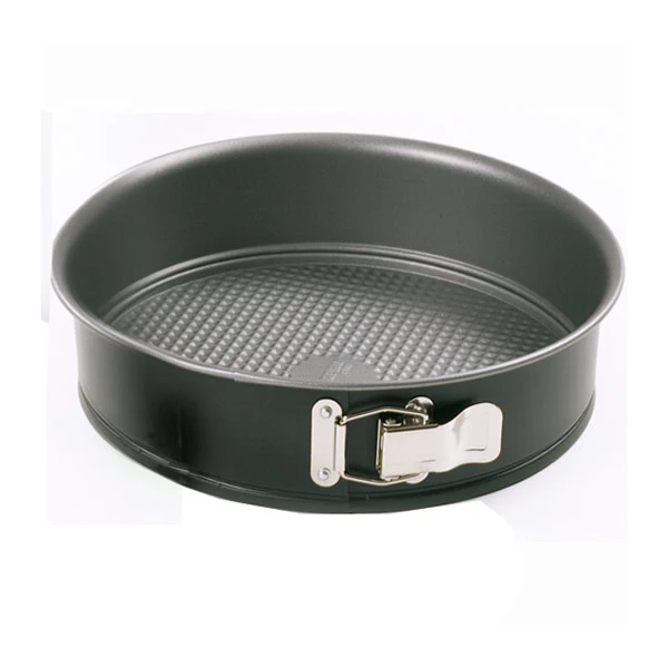 Easily create impressive desserts such as cheesecakes and coffee cakes with this springform pan by Norpro. Fabricated from durable aluminized steel, it has a dark finish that absorbs heat rather than reflecting it. The pan features a spring latch that securely holds the form together, offering a tight leak-proof seal to prevent messy spills. When the cake is cool, just open the buckle and gently lift straight up for flawless, beautifully intact food. Oven-safe to 500 degrees Fahrenheit, the pan a high-quality nonstick coating that ensures effortless food release, and is dishwasher safe for easy cleanup.