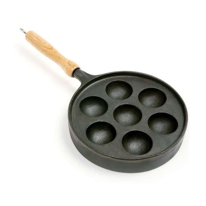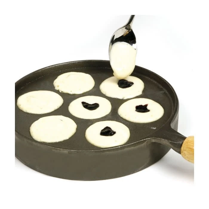 Enjoy traditional Danish stuffed pancakes made right in your home with the Aebleskiver pan by Norpro. Crafted of cast iron, it makes up to seven perfectly shaped pancake puffs at a time. The ergonomic handle stays cool to the touch for safe, comfortable cooking, and the pan heats quickly and evenly. Best of all, recipes delectable enough to inspire both novice and well-seasoned cooks are included.
