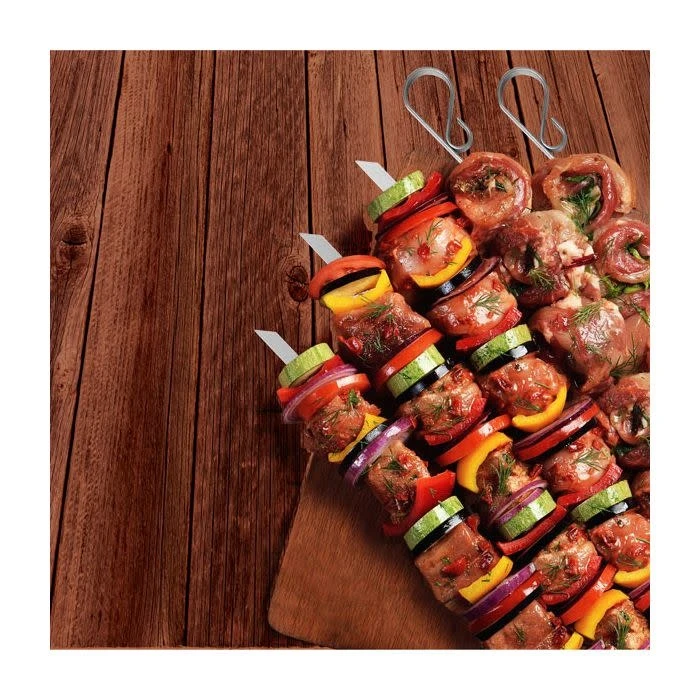 The smooth metal surface makes it easy to slide food on and off. Flat, wide surface allows skewers to be flipped without ingredients rotating, allowing for even, thorough cooking. Large rounded loop handle is easy to grip and turn, cools quickly and is great for hanging to store. Support thick, larger kebabs, chunks of beef or pork, fish, even vegetables, like tomato and mushrooms won’t slip or spin.