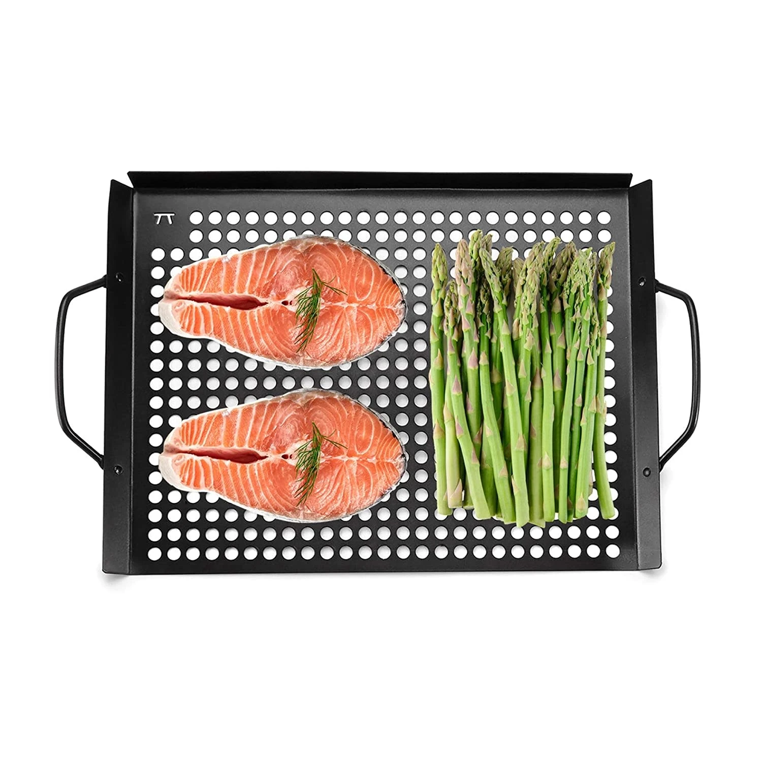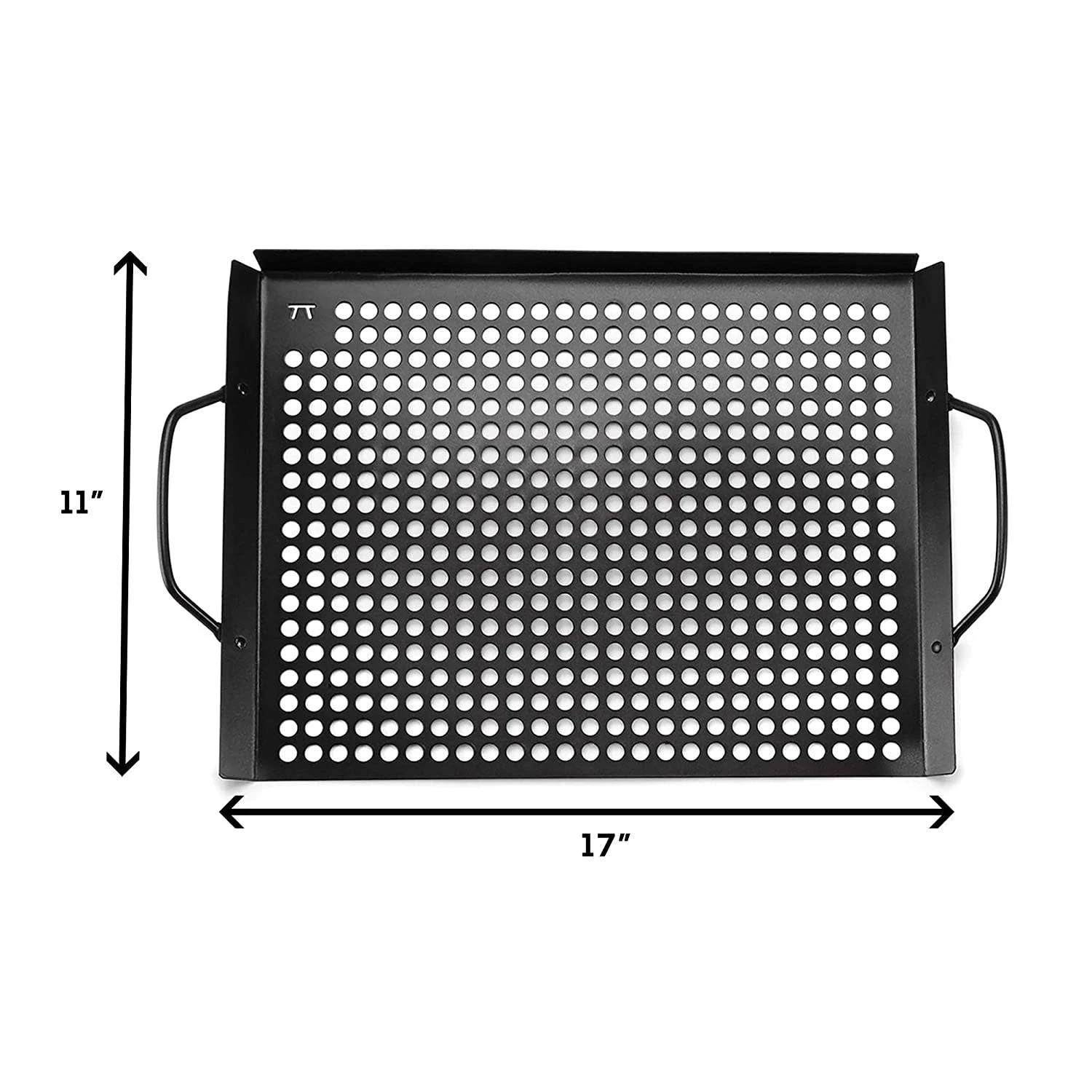 - Nonstick design brings a modern look and long-lasting durability to the grill, perforated bottoms allow even airflow over and under food, while any drippings drain into grill’s grease drip tray.