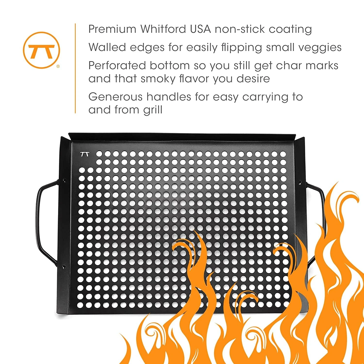 Looking for the utmost in grilling ease? Take the task out of grill top cooking with our Nonstick Grill Grids! This perforated grill topper makes cooking smaller cuts of fish, meat & vegetables easy. This nonstick grill grid is similar to our stainless-steel and copper nonstick versions. For safe cooking & easy clean-up due to its high quality nonstick PTFE/PFOA free coating, try this grill grid with delicate seafood, shrimp, meats & vegetables. It is also crafted to withstand extreme temperatures from heat and flame. The perforated grilling surface will enhance your foods’ natural flavors and leave you wanting more. Crafted to withstand high heat, this grill grid can handle the sizzle!