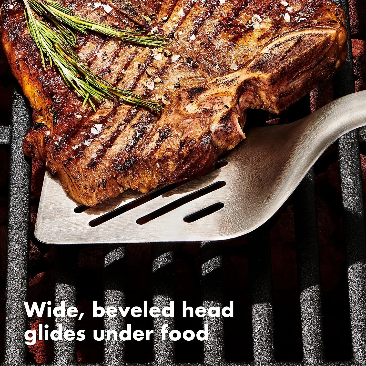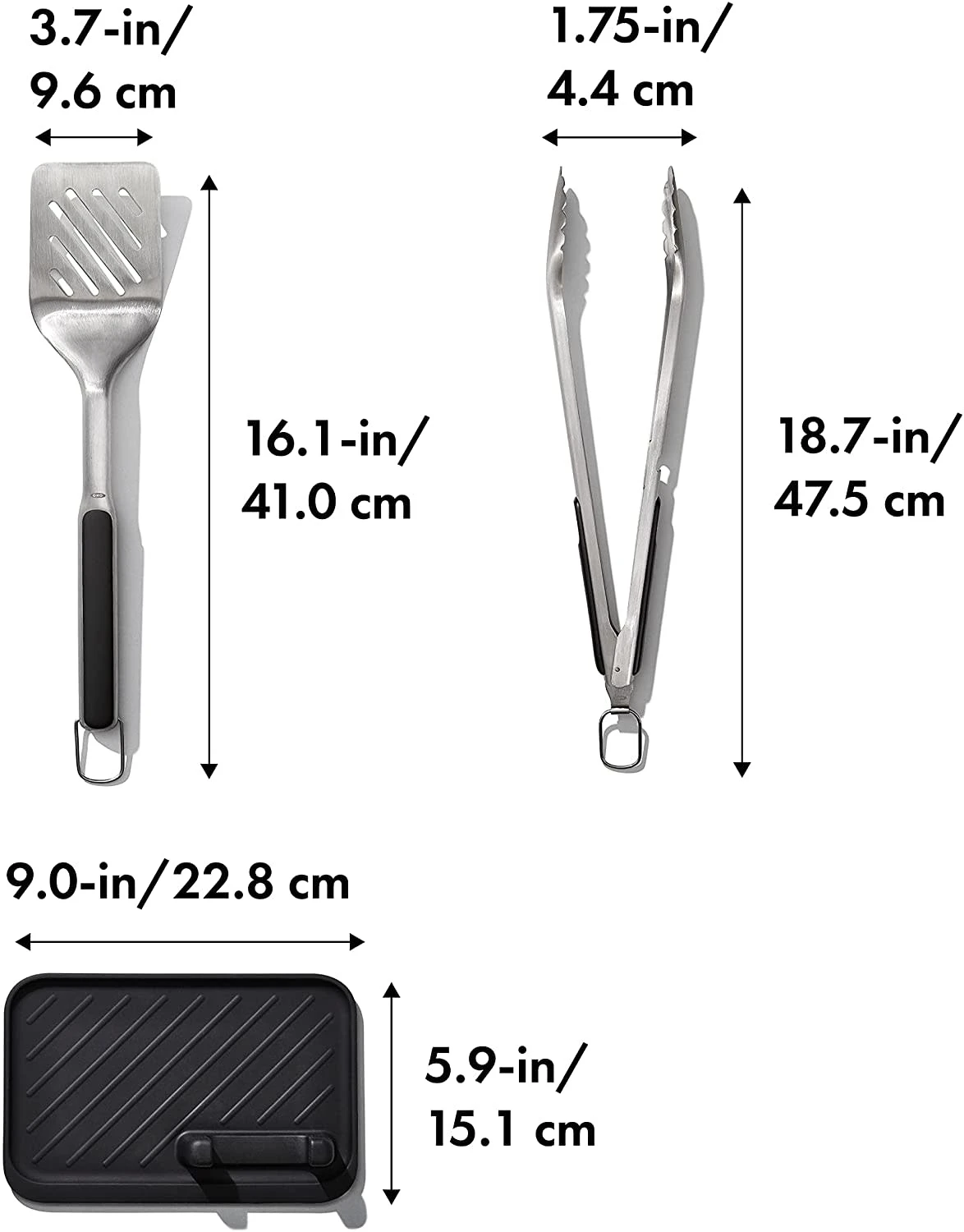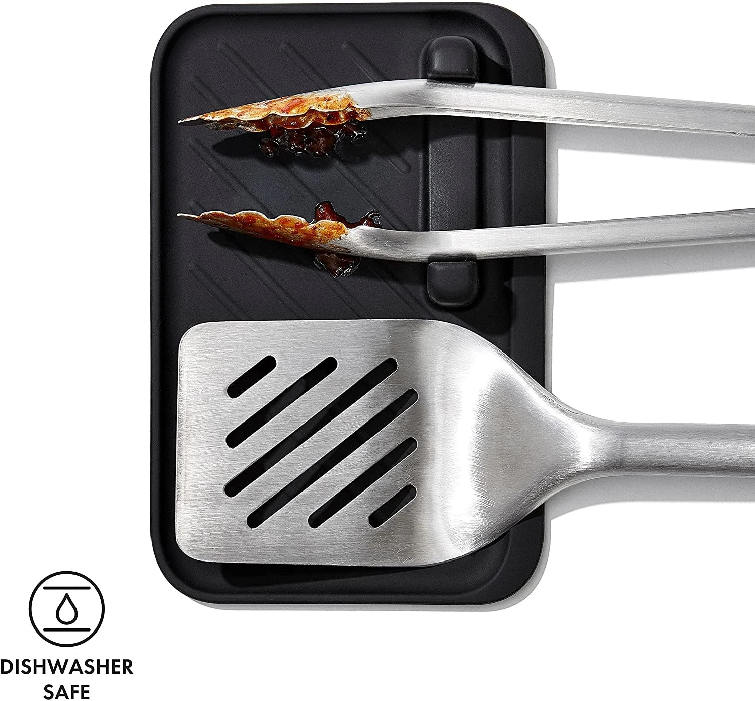 The set includes Grilling Tongs (with scalloped edges for fumble-free grabbing and a built-in bottle opener for grill-side sipping). A Grilling Turner (with a double-bend design for leverage while flipping). Finally, the Grilling Tool rest provides a neat, heat-resistant surface to rest your tools while you grill. The non-stick silicone construction and unique tong holder help with one-handed use–no more locking and unlocking tongs between turns. The tongs and turner have extra-long handles and non-slip grips for comfort and control.