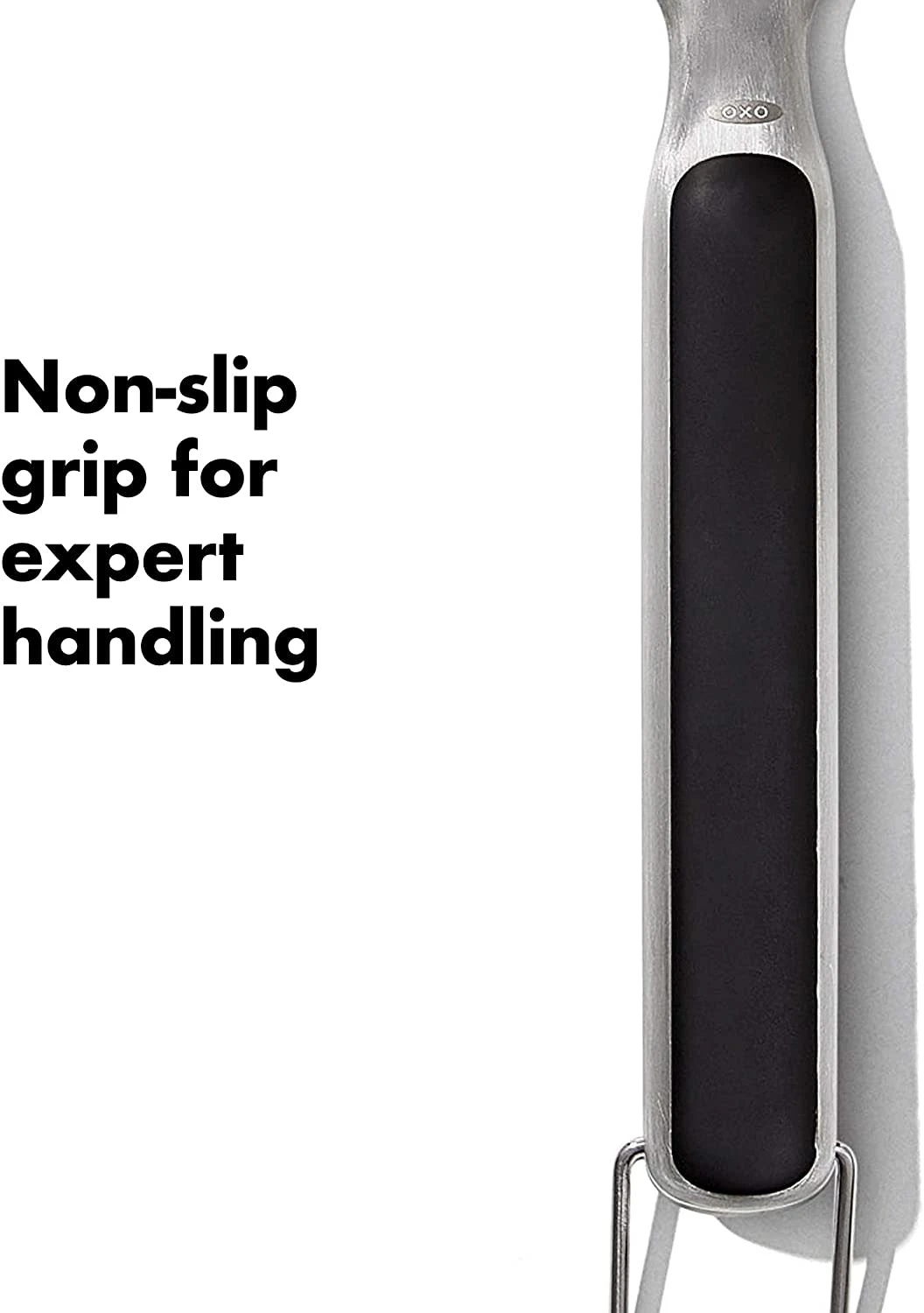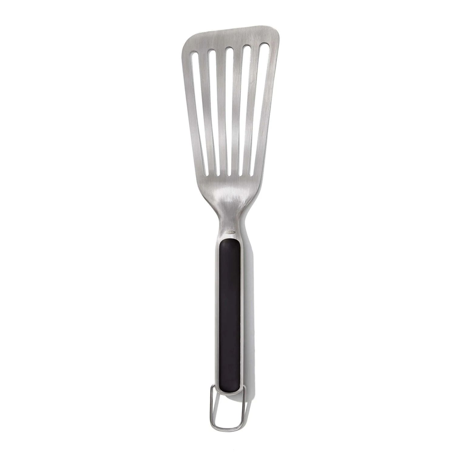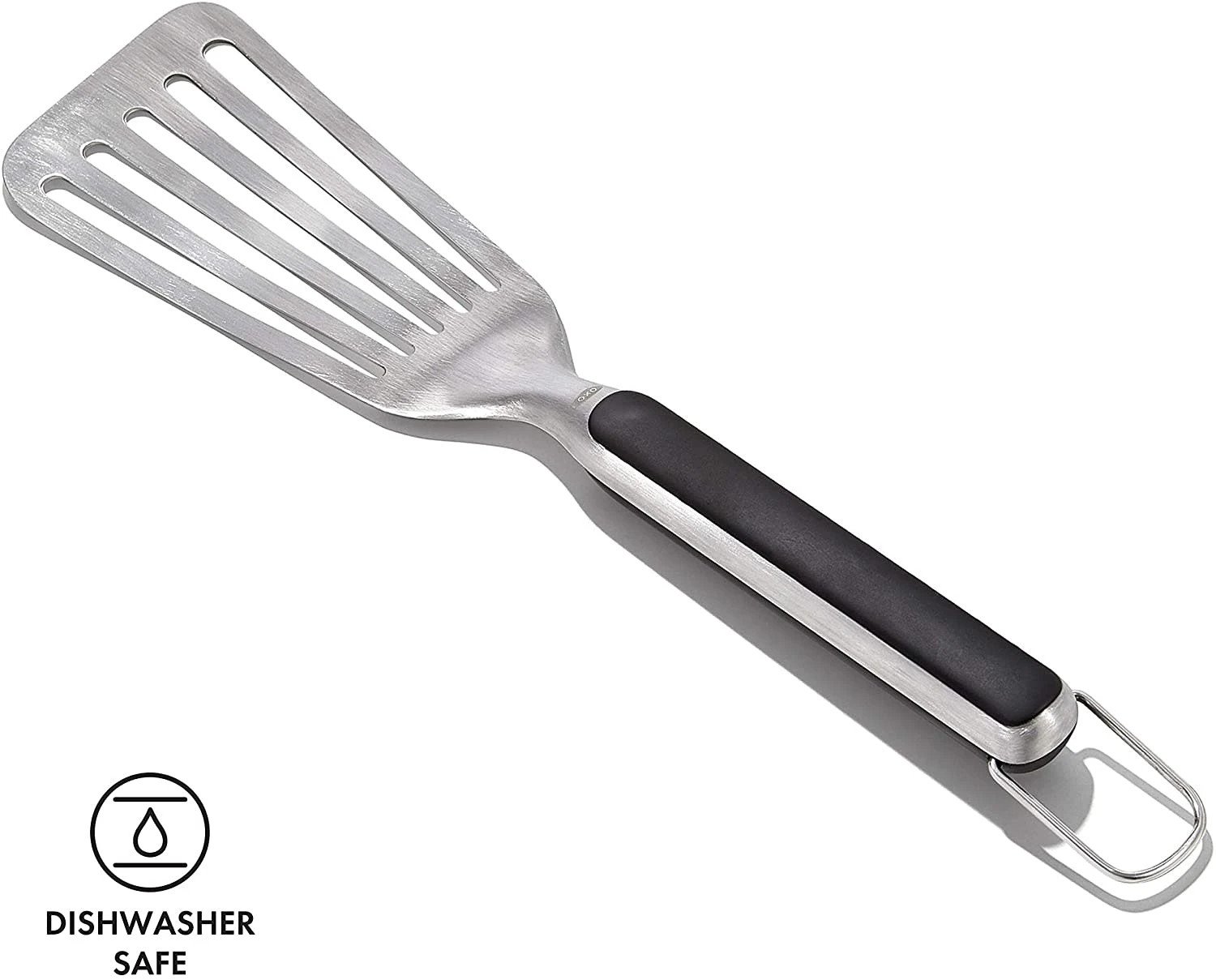slide seamlessly under the flakiest fillet. But the bendy, stainless steel head is also sturdy enough to hold the thickest pork chop. And with a comfortable, non-slip grip, plus a convenient hanging ring for