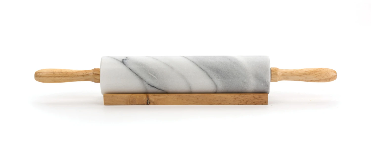 - Natural white marble with polished hardwood handles and stand, an added attraction to the counter or easily stores away.