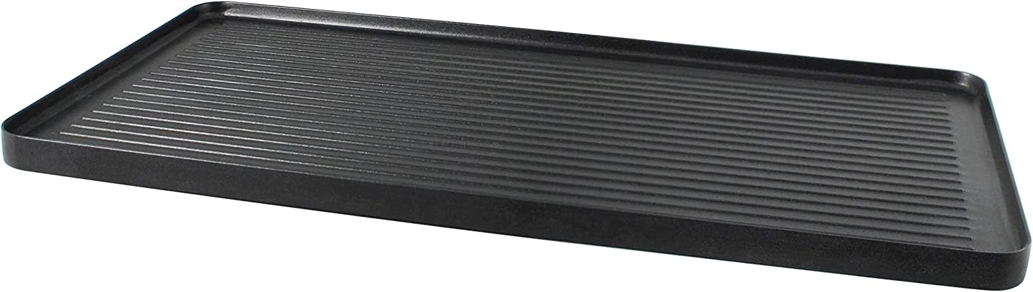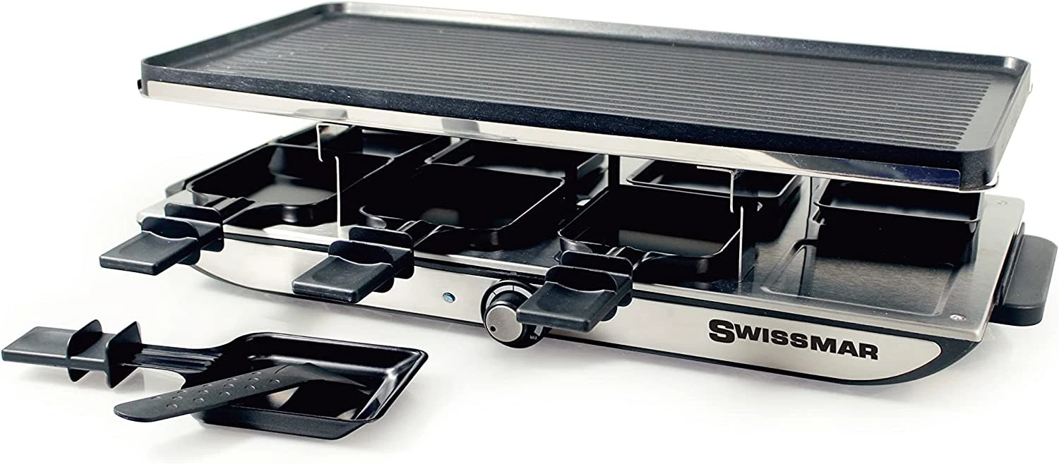 Try the traditional Swiss Raclette recipe or invent your own grilling sensations, the possibilities are endless. Turn the grill top around for some delicious crepes for dessert or pancakes in the morning. Features a polished stainless steel base with black accent and a non-stick reversible cast aluminum grill top. For 8 persons.