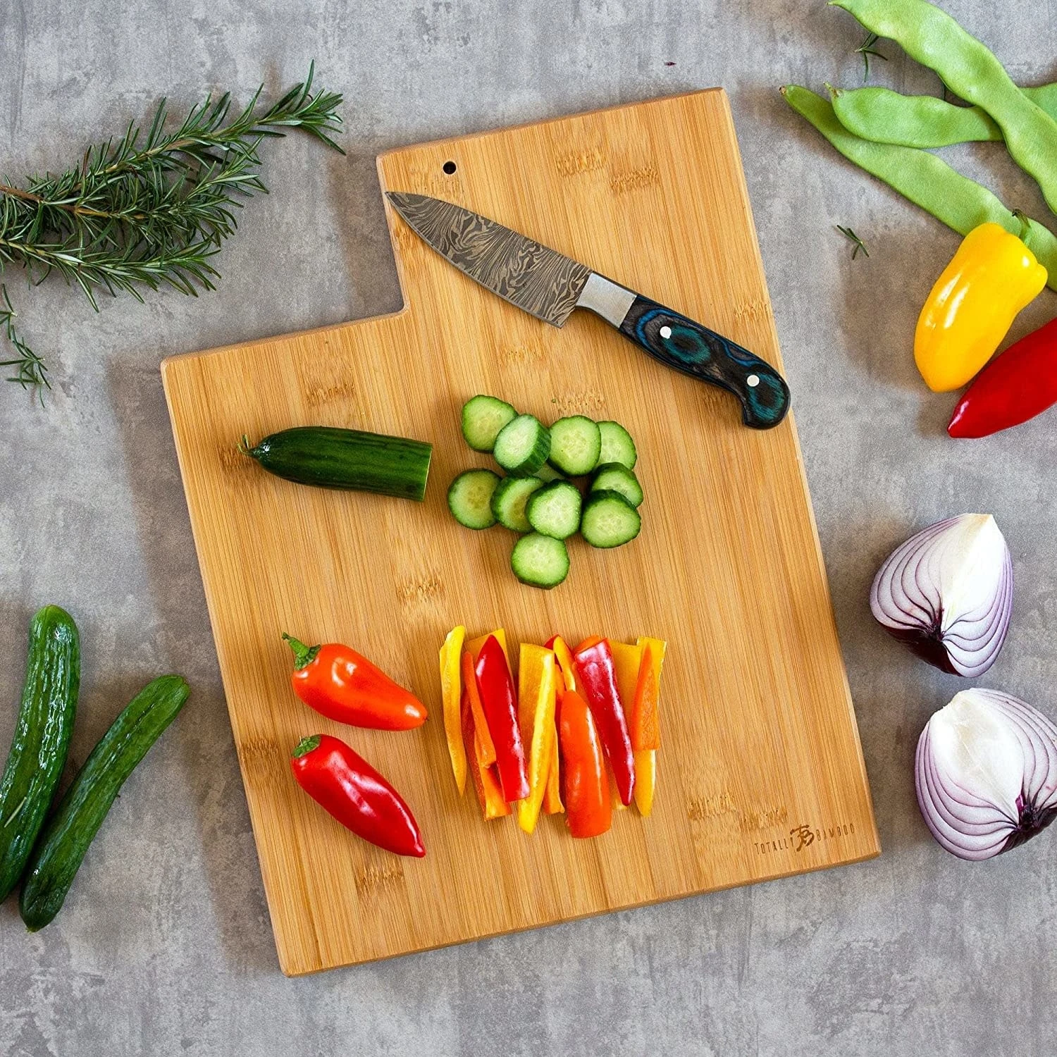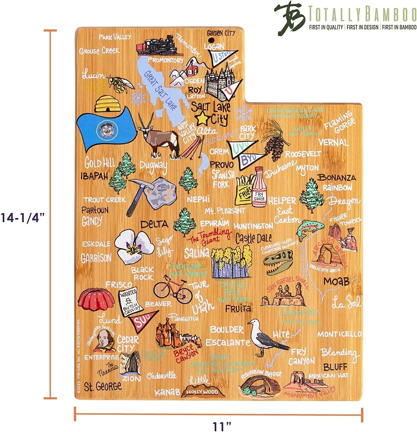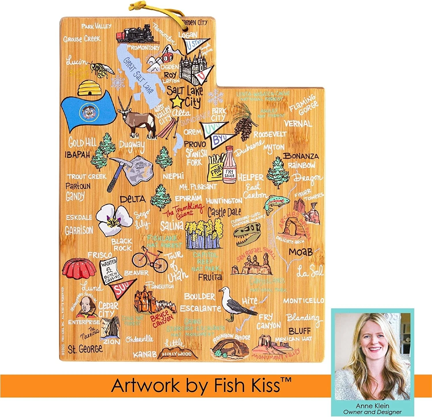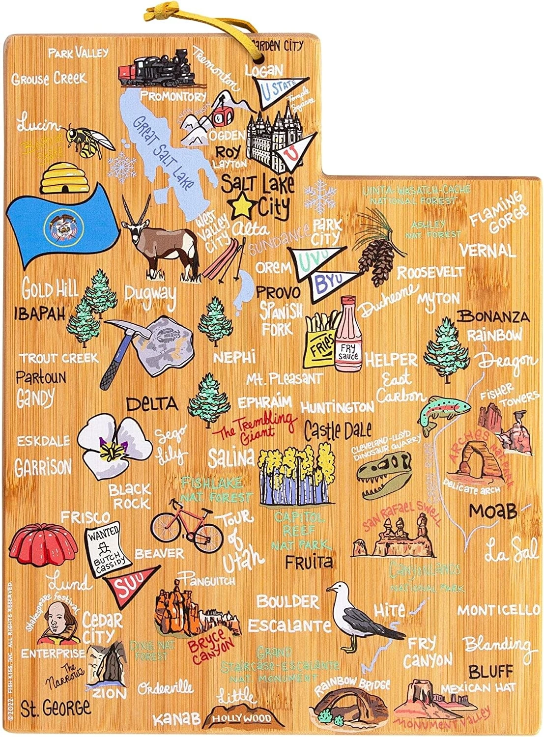 This Utah shaped board features beautifully illustrated artwork by Fish Kiss artist Anne Klein of all the top towns and attractions in the state— see if you can find your home town! A fun and unique choice as a charcuterie board, you and your guests will love reminiscing about all of your favorite places featured on the board. Before serving, flip the board over for use as a knife-friendly bamboo chopping board on the blank back side. When not in use, the included hang tie allows the board to easily double as wall art. Show off your love of Utah in your kitchen, dining room, den or office. The Utah Cutting Board with Artwork by Fish Kiss is a great gift idea for anyone on your list that loves Utah. The artwork is applied using a specialized UV printing technique that’s safe for food contact and will maintain its beautiful color.