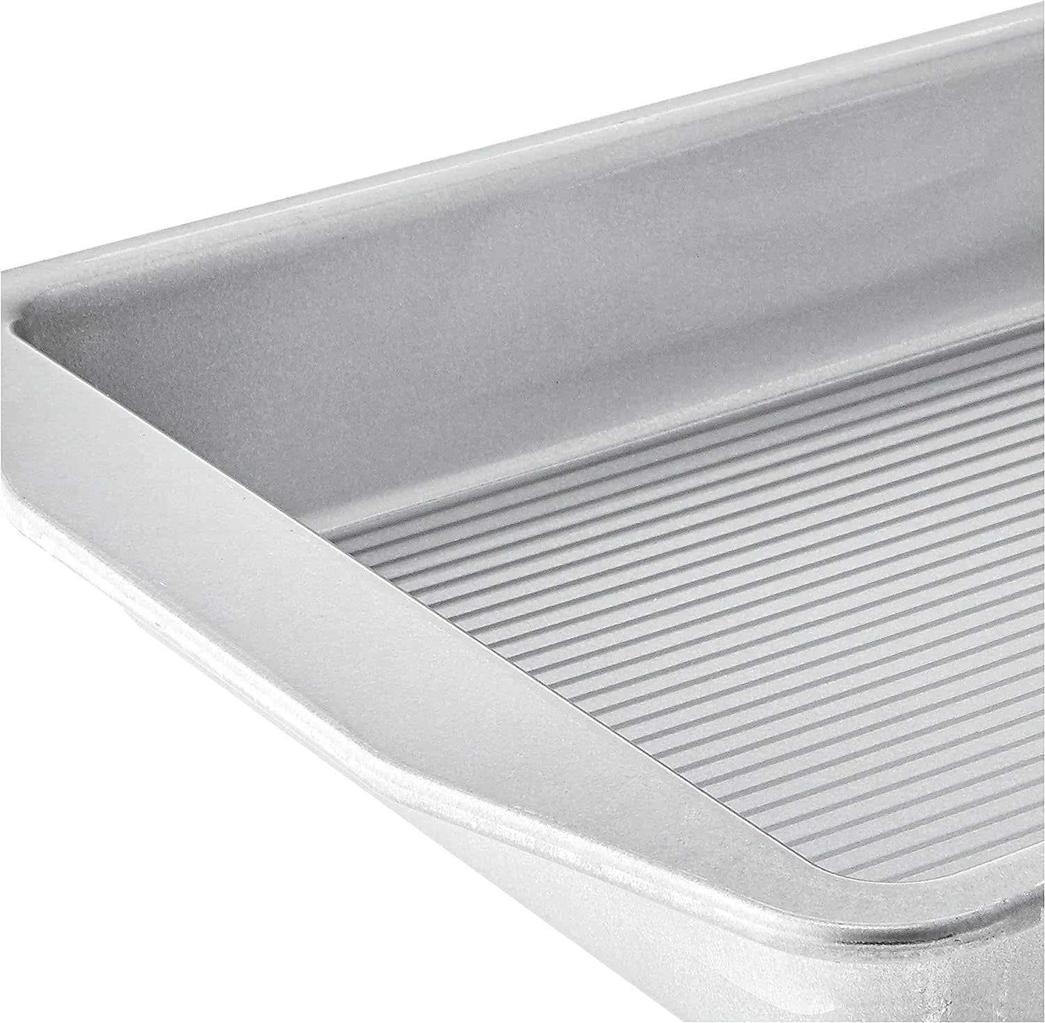 This Rectangular Cake Pan by USA Pan is made in the USA from globally sourced materials by a family owned and operated business. The American Bakeware Classics line of bakeware is suitable for your basic “ABC’s” Of baking. These baking pans are affordable and a great value for bakers looking to save money. The nonstick coating, which is PFOA and BPA free, promotes easy release for baked-goods and makes the pans easy to clean. To protect the nonstick coating, hand wash with warm water, soap and a gentle sponge. Easy-grip handles are perfect for inserting or removing the pan out of the oven. USA Pan is a Bundy family owned company, based in the greater Pittsburgh, Pennsylvania area.