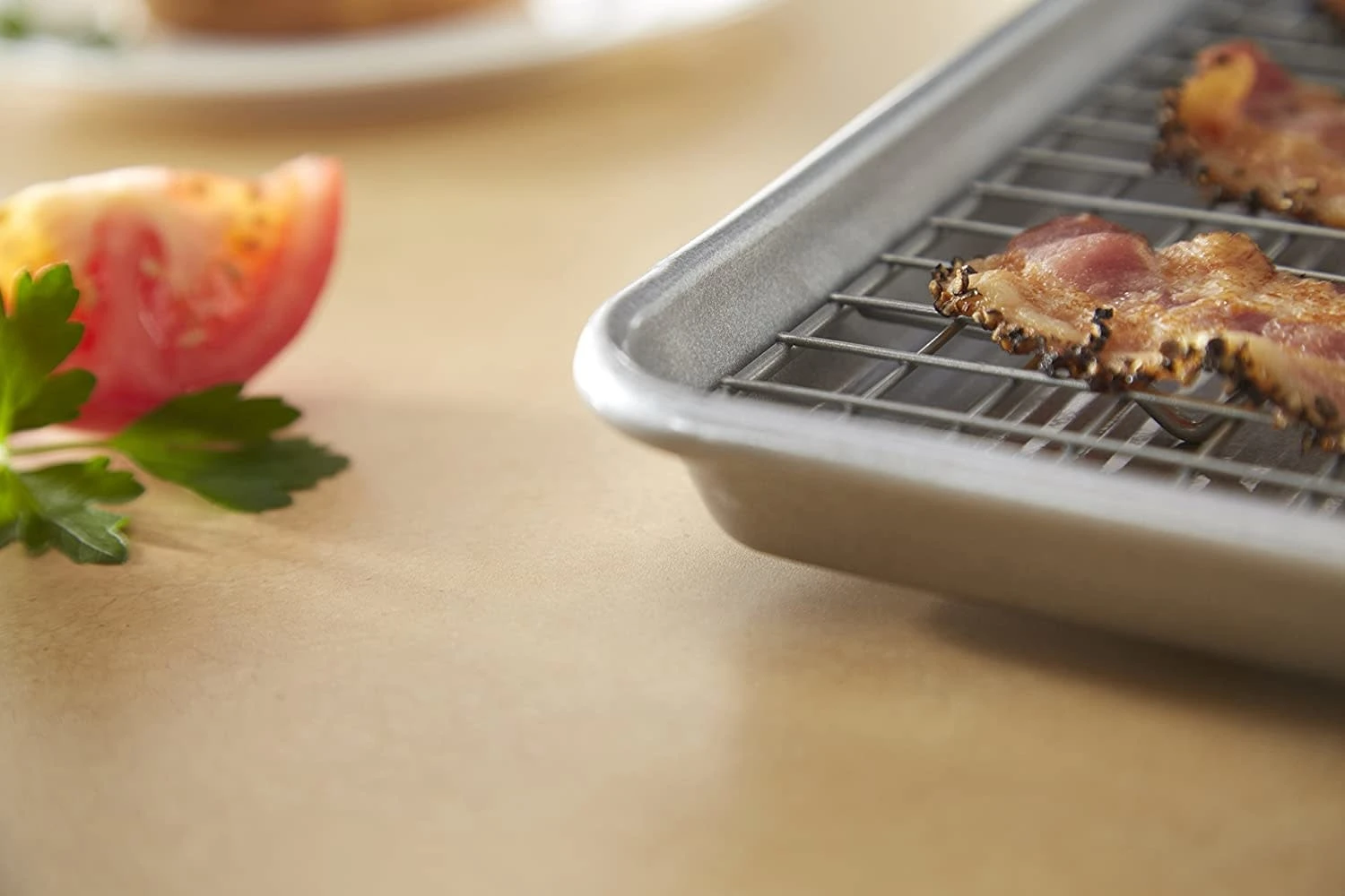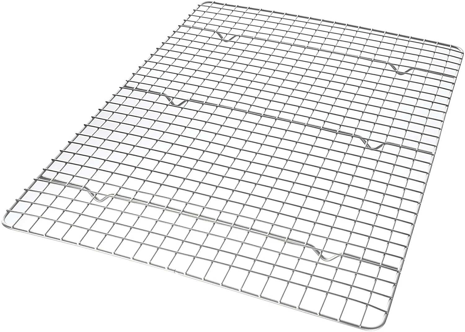 For the serious home chef, you can never have too many baking racks. Use them to cool baked cookies, hold decorated cookies for setting, roast veggies, cook bacon, glaze or ganache desserts. . . the list is endless. Use this half sheet cooling / baking rack with the USA Pan Half Sheet Pan and you have an amazing duo. The baking rack fits perfectly in the sheet pan and both clean up easily with USA Pan’s much-lauded non-stick coating. A quick hand wash with warm soapy water and clean up is done. This will likely become a go-to for your kitchen, like it is for the professionals.