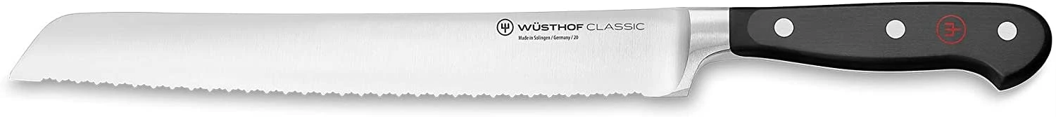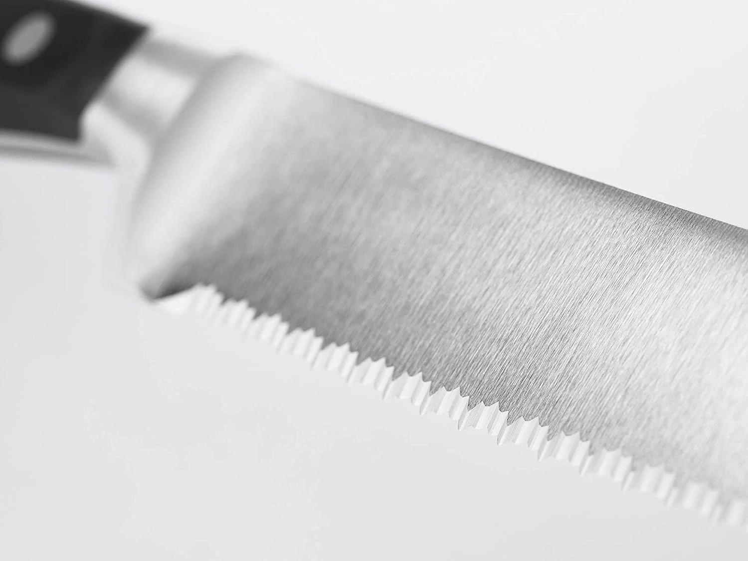 The Wusthof 9″ Double Serrated Bread Knife has twice the number of serrations (serrations within the serration). This uniquely designed blade glides through crusty breads without damaging the inside or producing a lot of crumbs. This knife can even be used on delicate produce or angel food cake.