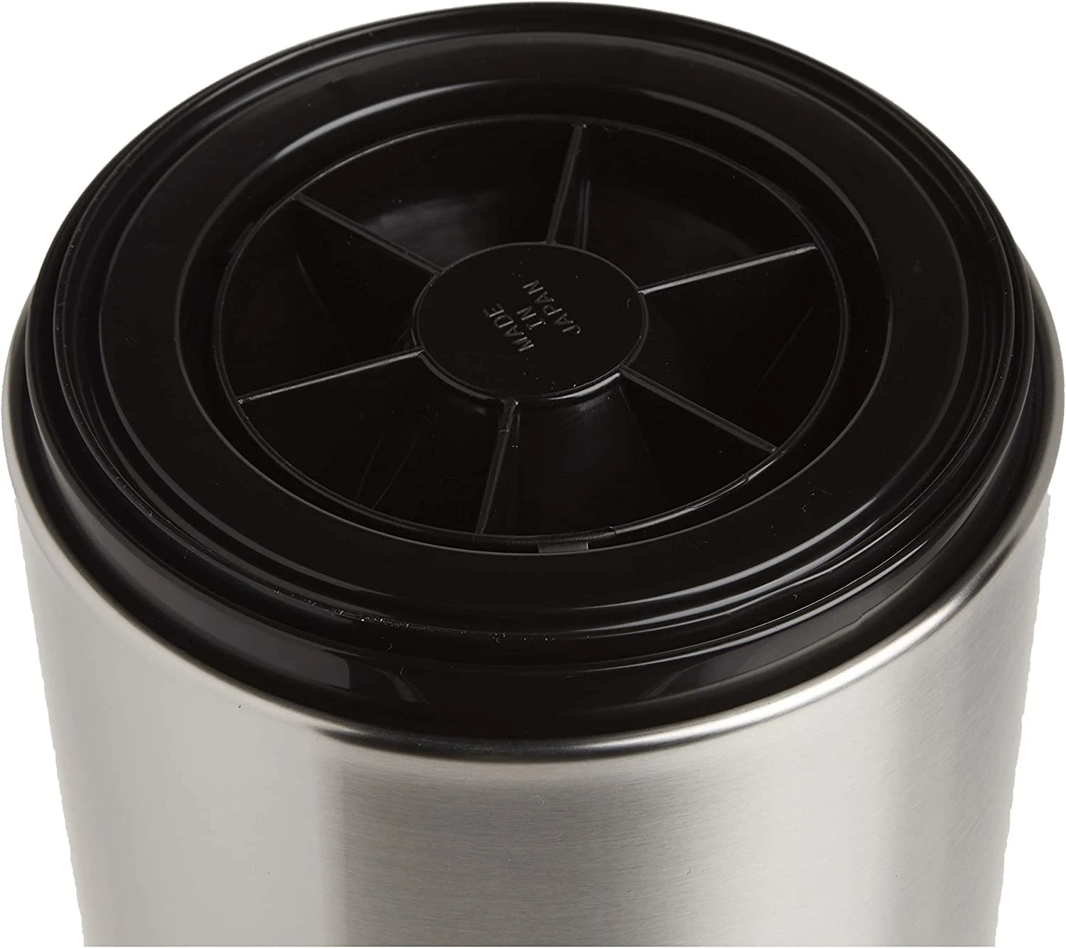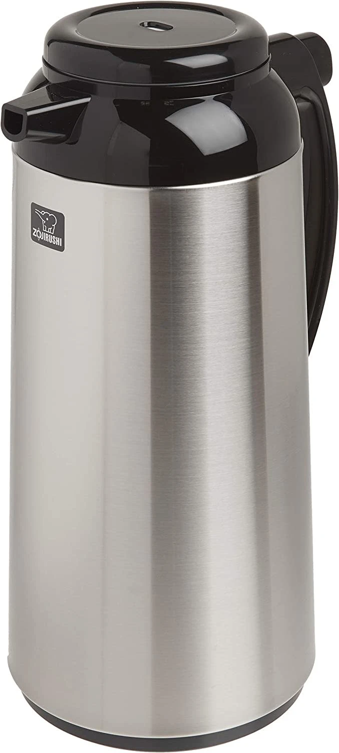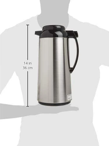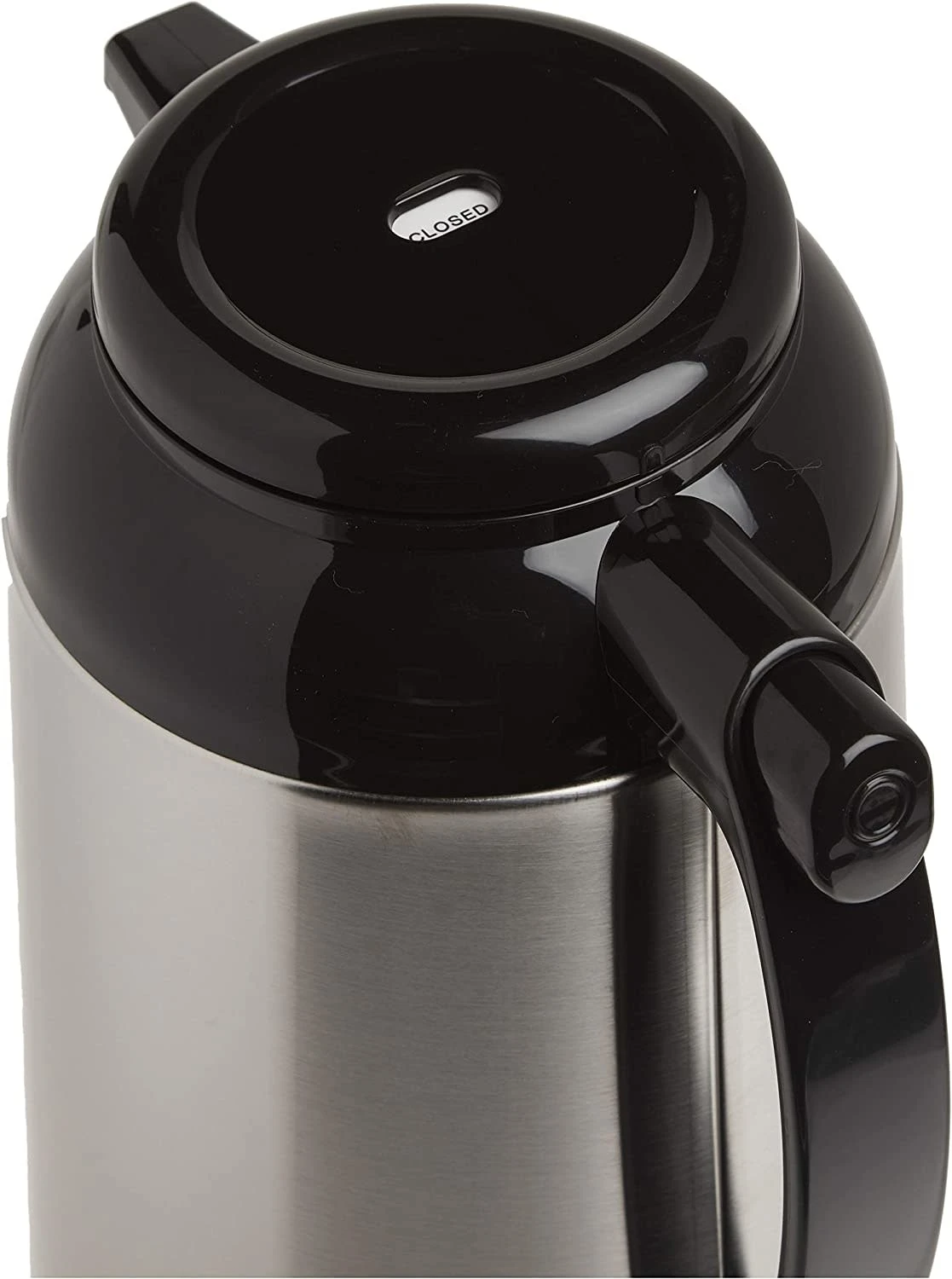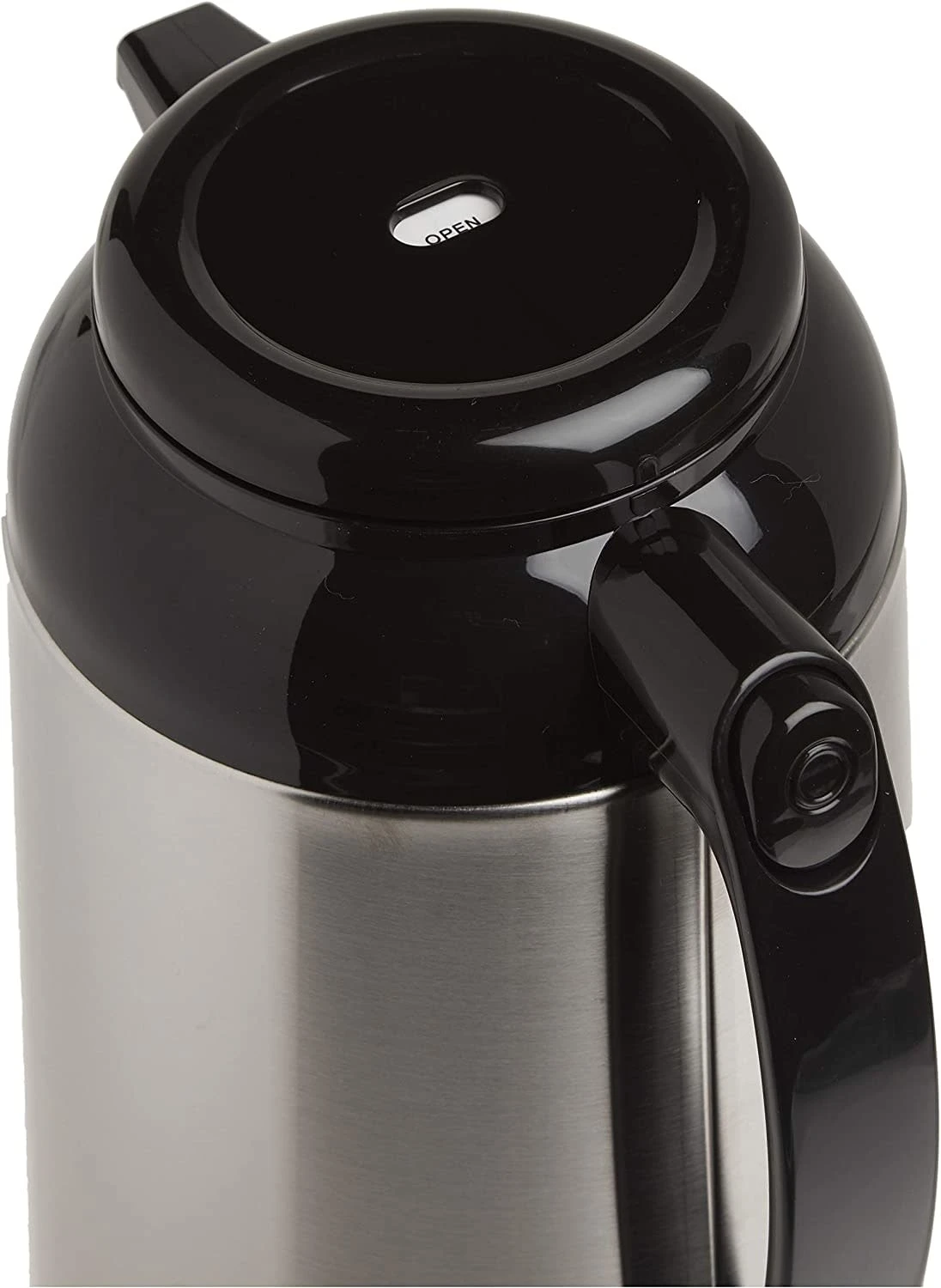 Well-respected Zojirushi brand makes durable, reliable products. This thermal carafe is no exception, with a classic, simple design that keeps coffee and other hot beverages hot for hours. A button you press with your thumb while gripping the handle opens the carafe for serving, doing away with the need to partly unscrew the lid for pouring. An indicator on the lid tells you if the carafe is open and ready to serve, or closed. When open, the outer rim supports coffee filter holders for brewing coffee directly into the carafe. Vacuum glass liner provides excellent heat retention.